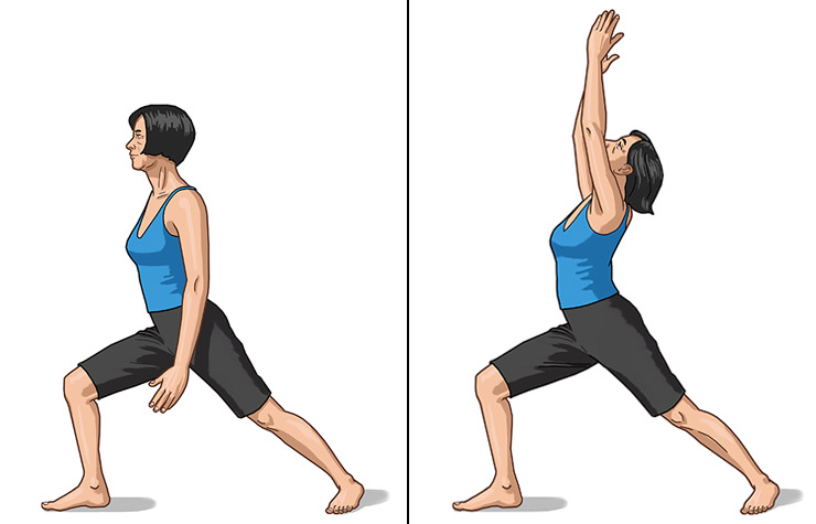 WARRIOR 1 (ท่าวีรบุรุษ 1): ยืนแยกเท้ากว้างประมาณสะโพก ก้าวเท้าซ้ายไปด้านหลังประมาณ 3 ฟุต ชี้ปลายเท้าซ้ายออกไปด้านนอก งอเข่าขวาให้เป็นมุมฉาก (ตั้งฉากกับพื้น) ชูแขนทั้งสองข้างขึ้นเหนือศีรษะ มองขึ้นด้านบน ค้างไว้ 3 ลมหายใจ แล้วกลับมายืน ทำซ้ำโดยสลับข้าง